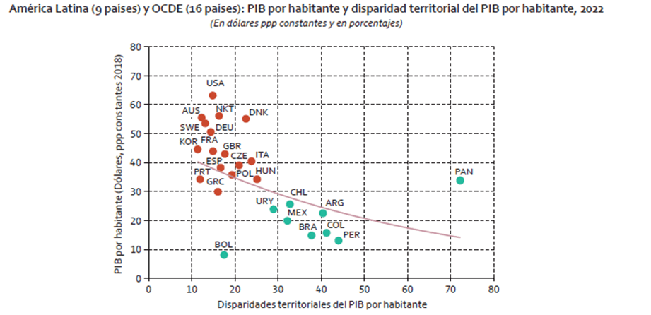 Los países de la OECD (graficados con los círculos rojos) tienen un PIB per cápita o por habitante, elevado, bastante mayor que los países de América Latina y por ello se ubican al lado izquierdo del cuadrante. Sin embargo, los países de América Latina se ubican en el centro y hacia el lado derecho del cuadrante por la disparidad territorial del PIB, destacando nuevamente Panamá.