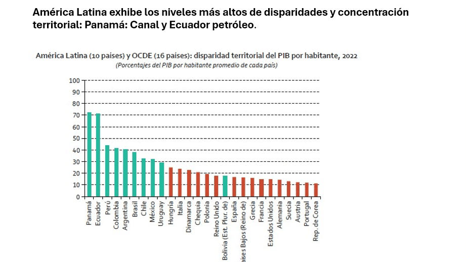 Encabeza la lista del nivel más alto de disparidad y concentración territorial, Panamá, por la gran concentración de su PIB, ascendente al 85% en la zona interoceánica conformada por el eje de dos provincias, las de Panamá y Colón por donde transita el canal que abarca el 20% del territorio nacional dejando a 8 provincias y 4 Comarcas indígenas que abarcan el 80 % del territorio, con tan solo el 15% del PIB reflejado en serias carencias de infraestructura y servicios: