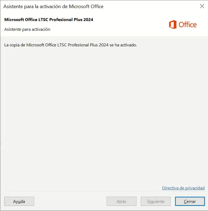 “La copia de Microsoft Office LTSC Professional Plus 2024 se ha activado.”